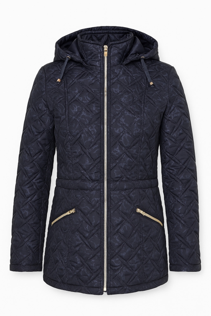 Elongated jacket heat-quilted floral print fabric stand collar with detachable hood long sleeve relaxed fit gold zip front pockets functional drawstring at waist on the inside