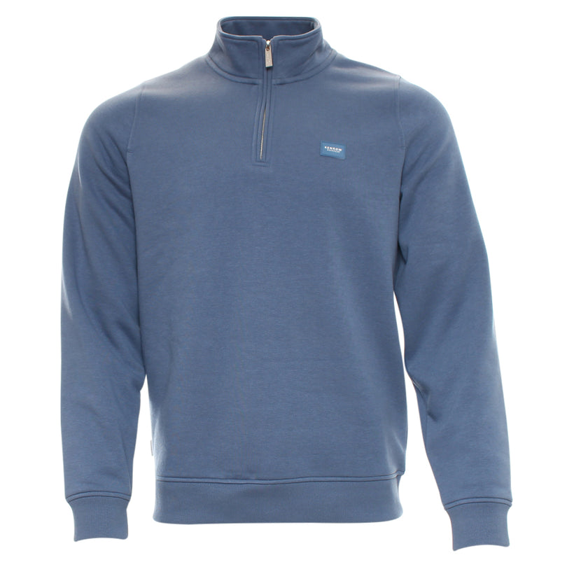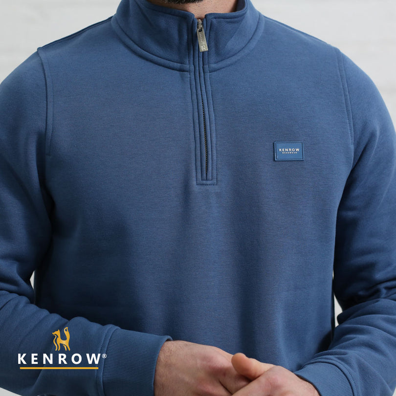 The Kenrow Damon Half Zip in Denim is a timeless casual staple combining comfort with understated style. Made from a soft cotton-rich fabric this half zip sweatshirt delivers everyday versatility with a polished finish. The classic denim blue shade makes it an easy go-to for relaxed yet refined dressing.nnDesigned with a streamlined silhouette ribbed trims and a practical zip neckline it layers effortlessly over tees or shirts. Finished with a signature Kenrow chest badge for subtle branding.nn