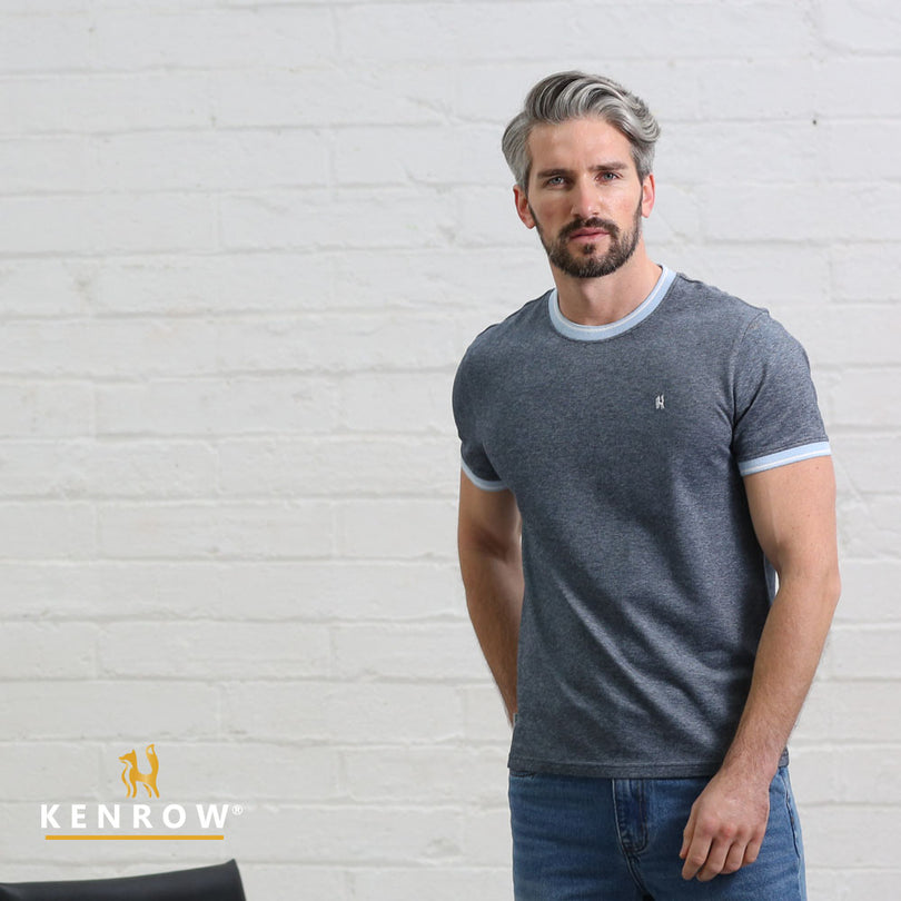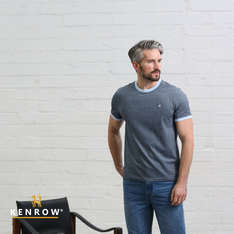 The Kenrow Flynn Tee in Sky is a refined everyday essential designed with subtle contrast detailing for a modern finish. Crafted from a soft stretch cotton blend this crew neck t-shirt delivers breathable comfort and a clean tailored fit. The soft sky blue tone paired with contrast rib trims at the neckline and sleeves adds a fresh contemporary feel to a classic silhouette.nnPerfect for effortless casual styling the Flynn Tee pairs easily with denim or chinos while maintaining a polished look. Finished with subtle Kenrow chest embroidery for understated branding.