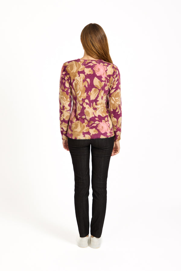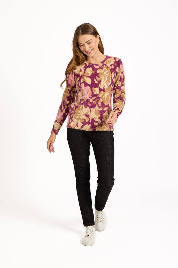 Mudflower Crew Neck Fluffy Floral Jumper Plum