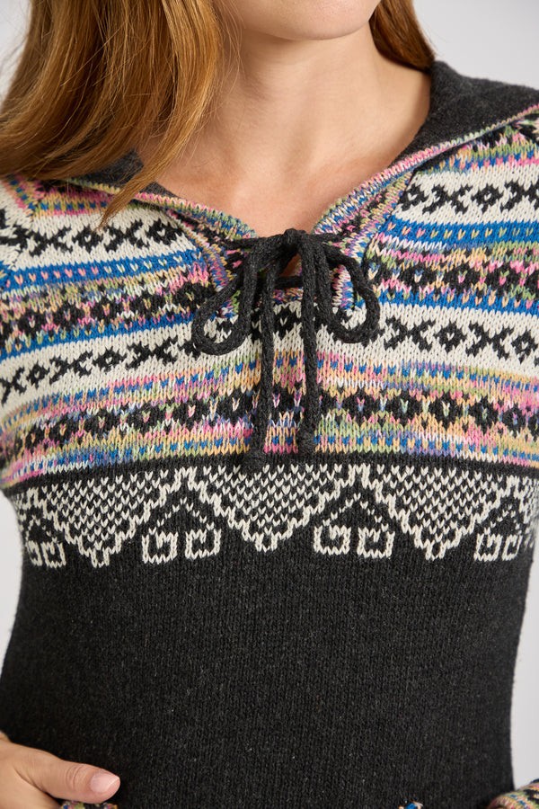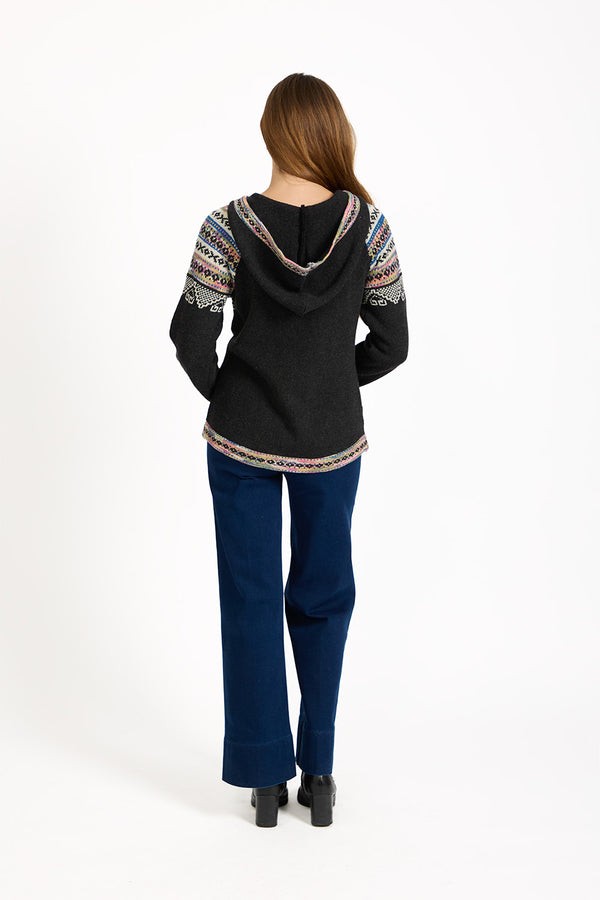 Our Fair Isle Hooded Jumper is a timeless piece that offers a blend of warmth and style. Its relaxed fit makes it a perfect piece for layering during the colder months while the intricate Fairisle knit adds a cozy seasonal feel.