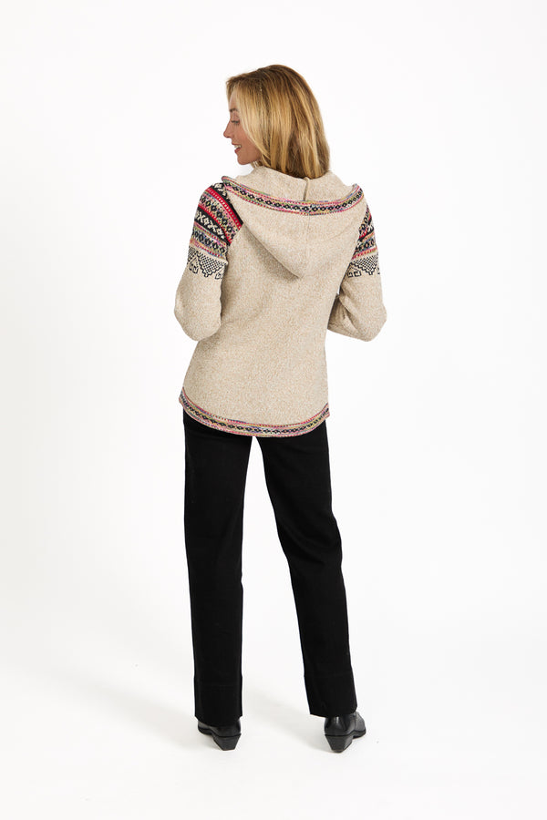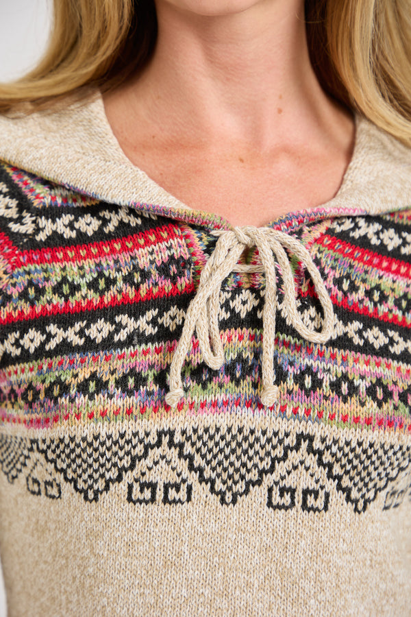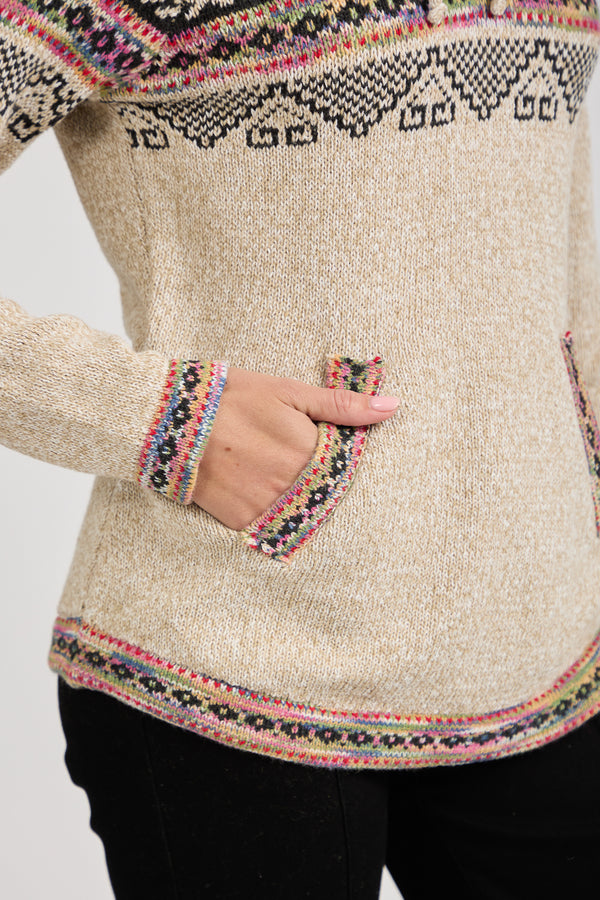 Our Fair Isle Hooded Jumper is a timeless piece that offers a blend of warmth and style. Its relaxed fit makes it a perfect piece for layering during the colder months while the intricate Fairisle knit adds a cozy seasonal feel.