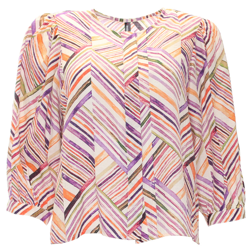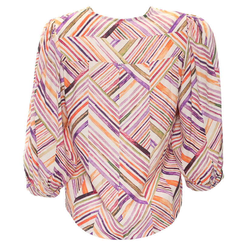 Chic modern and effortlessly stylish the Alexis Blouse by Rant and Rave is a standout piece that brings a fresh edge to your everyday wardrobe. Featuring an eye-catching geometric print in soft purple tones this blouse offers the perfect blend of sophistication and versatility.nnDesigned with a relaxed silhouette and a classic round neckline the Alexis Blouse drapes beautifully for all-day comfort. The three-quarter length sleeves add a polished finish making it easy to style for both work and weekend wear.nnPair with denim for a casual look or tuck into tailored trousers for a more refi