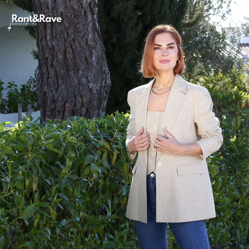 The Rant and Rave Edlynn Waistcoat in Sand is a chic and modern tailoring piece perfect for creating a polished yet effortless look. Designed with a flattering structured fit square neckline and button-front detail this ladies’ waistcoat offers a contemporary take on classic tailoring. The subtle pinstripe pattern and neutral sand tone make it easy to style as part of a co-ord or paired with denim for a smart-casual finish.nnIdeal for workwear occasion dressing or elevated everyday styling the Edlynn Waistcoat is a versatile addition to any wardrobe.