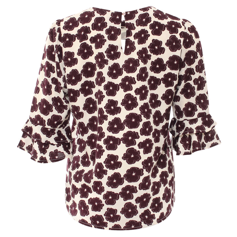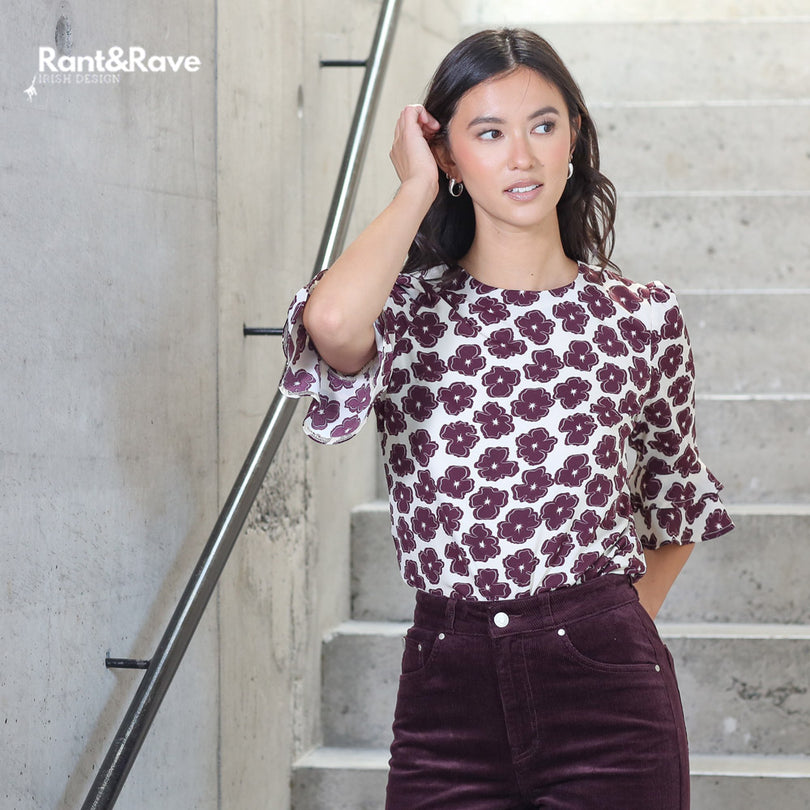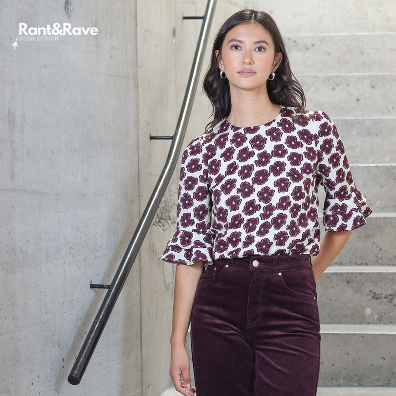 Elevate your everyday style with the Rant & Rave Maiya Top in Plum. Crafted in a soft lightweight fabric this blouse features a striking floral print in rich plum tones against a crisp ivory base. The round neckline and relaxed fit make it effortlessly comfortable while the ¾ length sleeves with subtle flared cuffs add a feminine touch. Perfect for both work and weekend wear it pairs beautifully with jeans skirts or tailored trousers for a chic versatile look.nnn