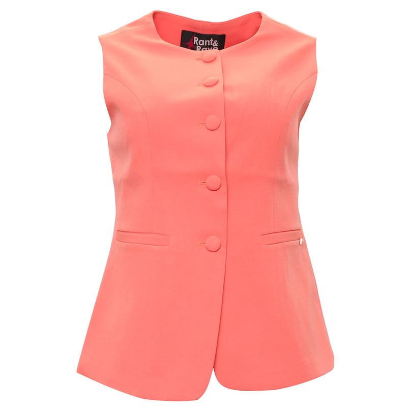 The Rant & Rave Melody Waistcoat in Coral is a sleek tailored piece designed to elevate modern occasionwear. Featuring a flattering sleeveless cut round neckline and statement button fastening this waistcoat offers a polished silhouette with a contemporary edge.nnPerfect for pairing with matching trousers for a chic co-ord set the Melody Waistcoat is ideal for weddings race days parties and special occasions. A standout coral piece that brings colour and confidence to any look.