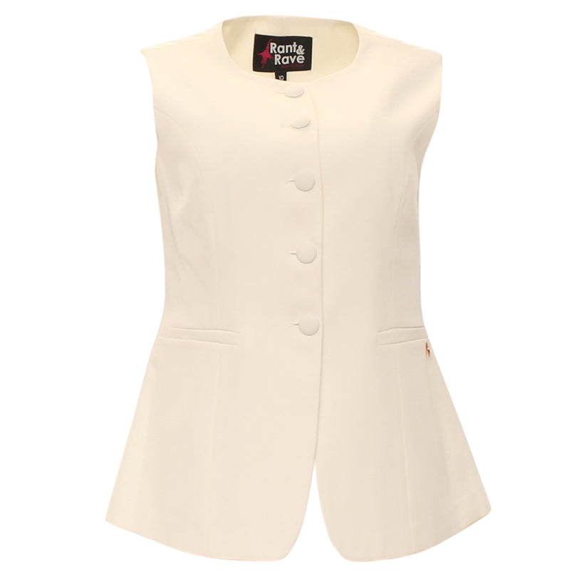 The Rant & Rave Melody Waistcoat in Off White is a timeless tailoring essential with elegant appeal. Designed with a sleeveless silhouette round neckline and classic button detailing this versatile piece creates a clean sophisticated finish.nnIdeal for styling as part of a co-ord set or layering over occasion outfits the Melody Waistcoat is perfect for weddings communions events and polished day-to-evening looks. A refined off-white waistcoat that adds effortless elegance to your wardrobe.