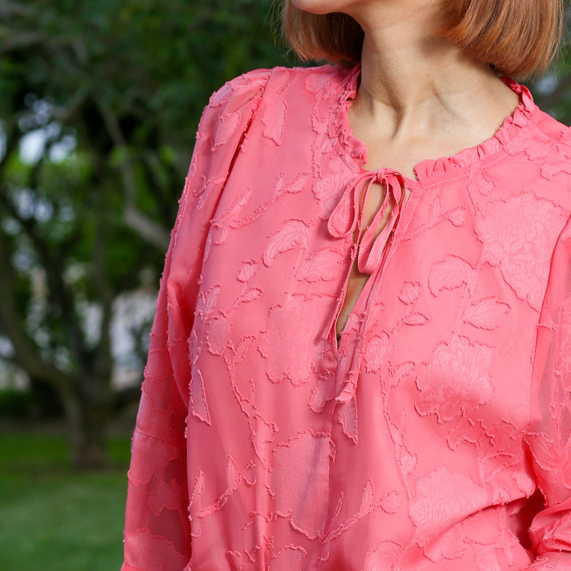 Softly feminine with beautiful texture the Primrose Top by Rant and Rave in coral is a standout piece that blends elegance with effortless wearability. Crafted in a lightweight fabric with subtle floral jacquard detailing this top adds depth and interest while maintaining a soft romantic feel.nnDesigned with a delicate frill neckline and tie-front detail the Primrose Top offers a flattering silhouette with a touch of charm. The relaxed fit and three-quarter length sleeves create an easy comfortable shape that works perfectly for both casual and dressier styling.