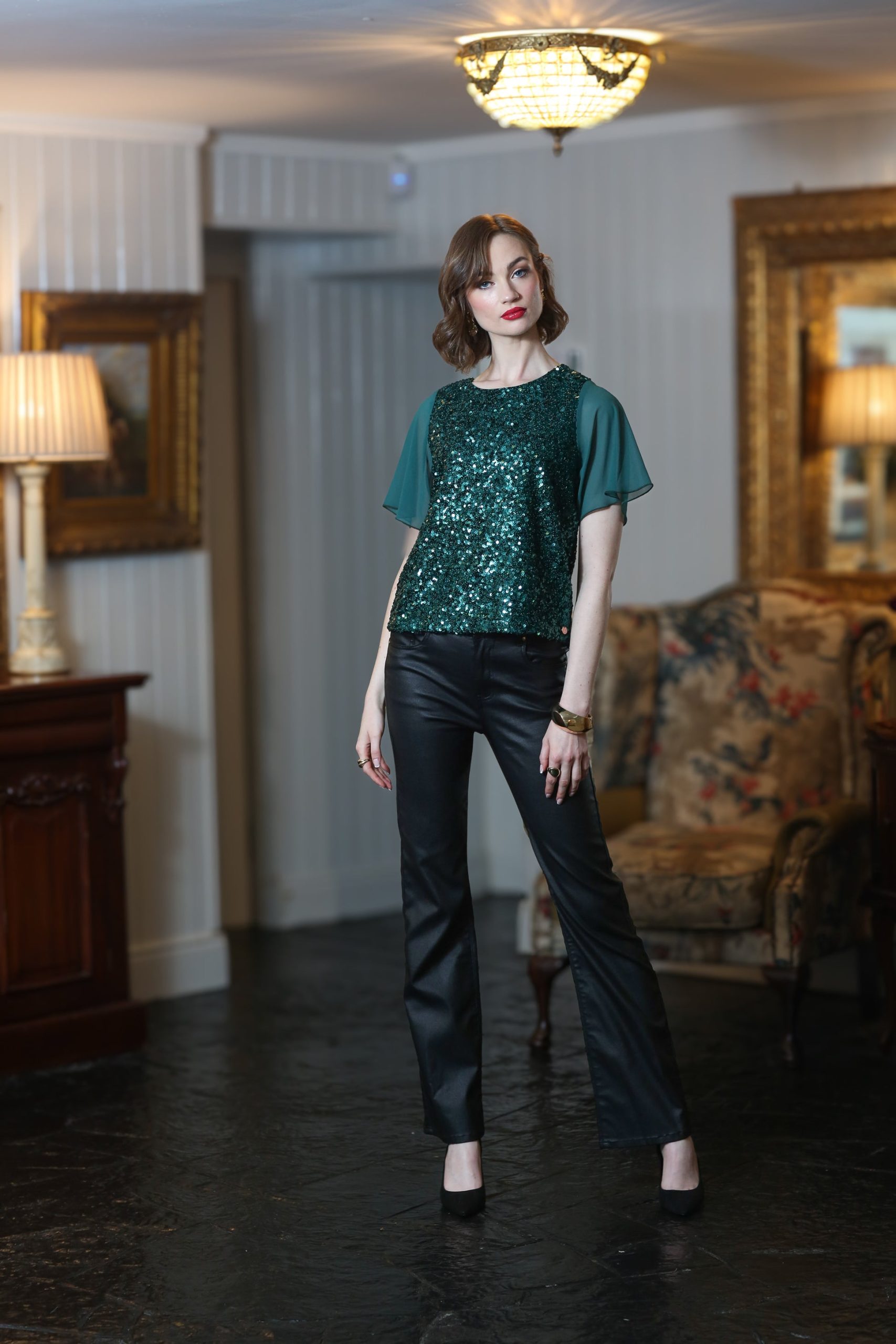 Add a sleek statement edge to your look with the Rant & Rave Trudy Bootcut Leatherette Jean in Black. Crafted from a premium stretch leatherette fabric these jeans sculpt and flatter while offering exceptional comfort and flexibility.nnThe classic mid-rise fit and subtle bootcut shape create a leg-lengthening silhouette — perfect for pairing with heels blouses or knits for an effortlessly polished finish.nnn