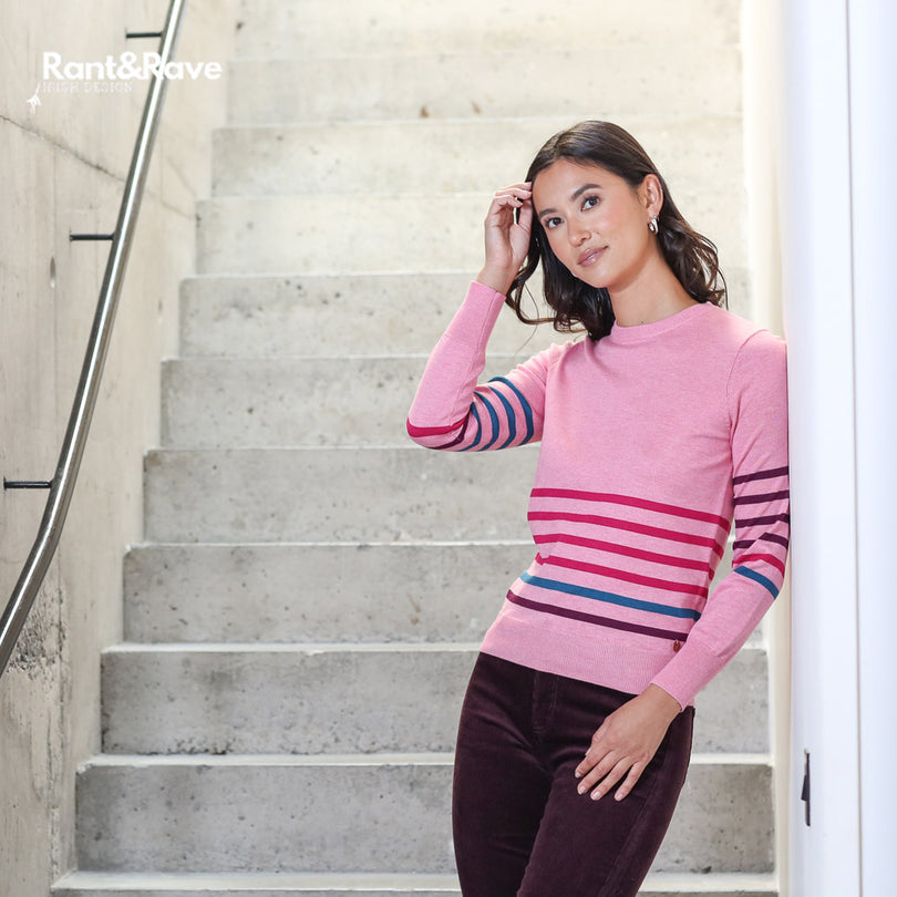 Rant and Rave Winslet Jumper in a delightful pink hue adorned with vibrant multicolored stripes. This cozy sweater is perfect for adding a pop of color to any outfit whether you’re dressing up for a casual outing or lounging at home. Crafted from soft breathable fabric it ensures all-day comfort while keeping you stylishly warm. Don’t miss out on this must-have piece that effortlessly combines fun and fashion!